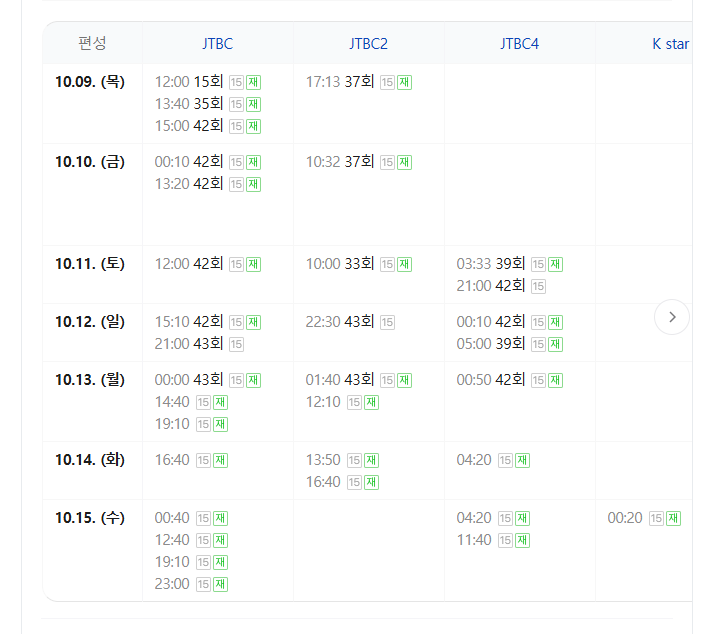| 10월 13일 (월) | JTBC4 | 오전 0:50 |